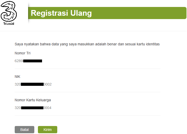 Untuk pengguna kartu SIM prabayar 3 (Tri) kamu bisa mengunjungi link / tautan https://registrasi.tri.co.id/reregistration. Silahkan masukan Nomor Tri, nomor NIK KTP dan nomor KK.